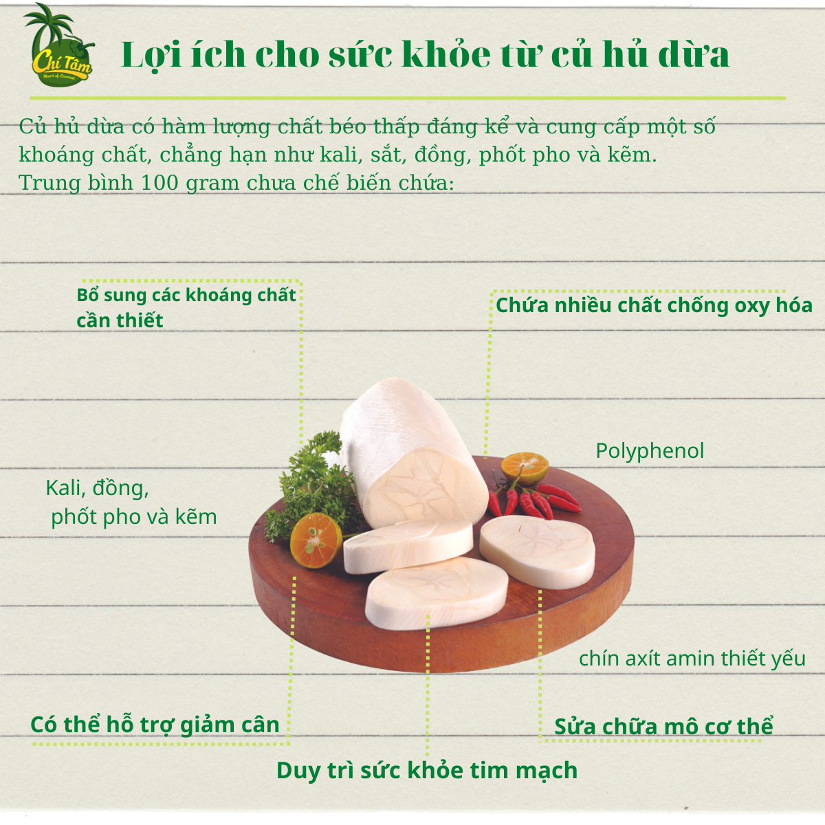 Đặc biệt, 100gr củ hủ dừa tươi, có thể cung cấp đến 36% nhu cầu Kẽm, 38% nhu cầu Kali và 70% nhu cầu lượng Đồng để cơ thể tiêu thụ trong ngày.