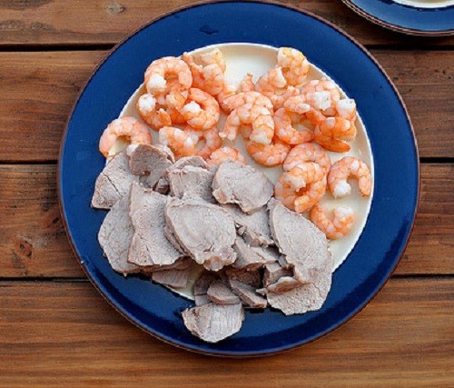 Tôm rửa sạch rồi đem luộc sơ, rồi bóc vỏ. Thịt ba rọi rửa sạch rồi cho vào nồi nước sôi luộc đến khi vừa chín tới thì vớt ra chờ hơi nguội thì cắt lát mỏng vừa ăn.