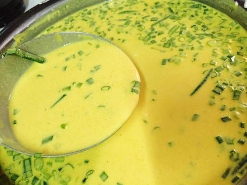 Cho bột gạo (hay bột bánh xèo) vào thau, tiếp đến chi một ít bột nghệ vào để tạo màu đẹp mắt cho món bánh sau đó trộn đều. Sau đó, cho từ từ 500ml nước ấm vào vừa cho nước vừa khuấy đều tay đến khi bột tan hết vào không bị vón cục thì cho tiếp 200ml nước cốt dừa vào. Để thêm độ béo cho món bánh, bạn có thể tách 2 quả trứng vào bát đánh tan rồi cho vào thau bột. Nêm thêm chút muối và đường vào sao cho bột vừa ăn. Cuối cùng cho hành lá cắt nhỏ vào trộn đều.
