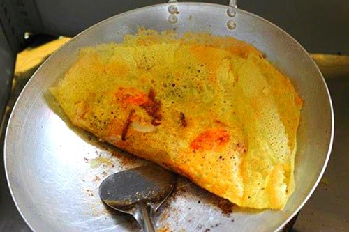 Khi các nguyên liểu đã sơ chế xong, bắt chảo lên bếp cho nóng, tiếp đến cho miếng mỡ heo vào tráng đều quanh chảo cho mỡ heo ra một ít nước mỡ thì dùng vá khuấy đều bột lên rồi múc một vá bột tráng mỏng đều khắp mặt chảo, tiếp đến cho củ hũ dừa vào cũng với tôm và thịt vào giữa rồi đậy nắp lại khoảng 2 phút để bánh chín. Khi bánh chín bạn mở nắp ra để bánh chín vàng giòn thì dùng sạn gập đôi bánh lại cho ra dĩa. Việc dùng mỡ heo thay dầu ăn khi chiến bánh nhằm để cho bánh khi chiên xong sẽ dễ gỡ ít bị dính và có mùi thơm hấp dẫn. Làm tương tự như thế cho đến khi hết phần nguyên liệu.