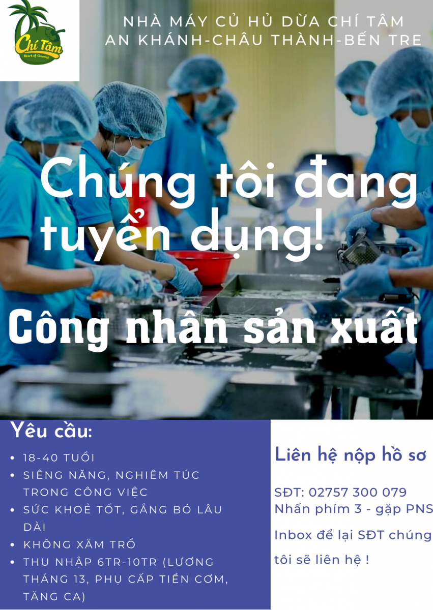 NHÀ MÁY CHẾ BIẾN CỦ HỦ DỪA CHÍ TÂM cần tuyển: